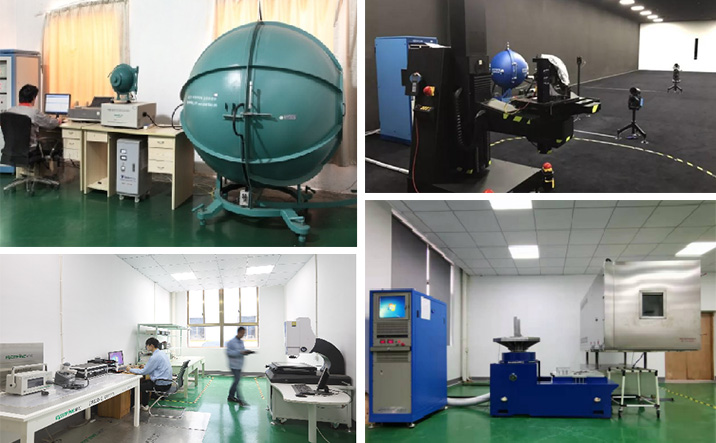公司设有‘实验检测中心’。配置了产品的检验、试验设备30余台,拥有全自动配光检测系统及35米标准暗室、三综合振动系统、温度冲击试验箱、冲击碰撞台、高低循环、盐雾、防尘、淋雨、三坐标、X荧光光谱仪、投影仪和端子分析装置等设备,为生产全过程提供可靠的质量保障手段,从根本保证灯具质量。
